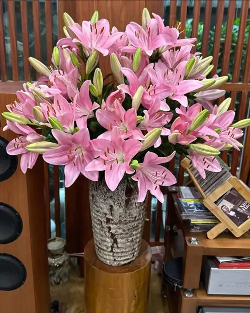 Bình hoa Ly hồng phấn đặt ở quầy lễ tân – vừa đẹp dịu dàng, vừa tạo thiện cảm.