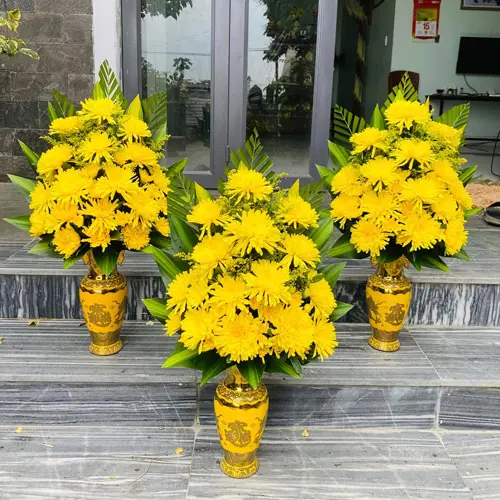 Hoa Cúc Vàng: Giá từ 50.000 VNĐ/bó (10 cành) đến 300.000 VNĐ/chậu lớn. Hoa cúc vàng tươi lâu, phù hợp cúng bàn thờ Thần Tài hoặc trang trí sảnh chính, mang ý nghĩa tài lộc bền vững.
